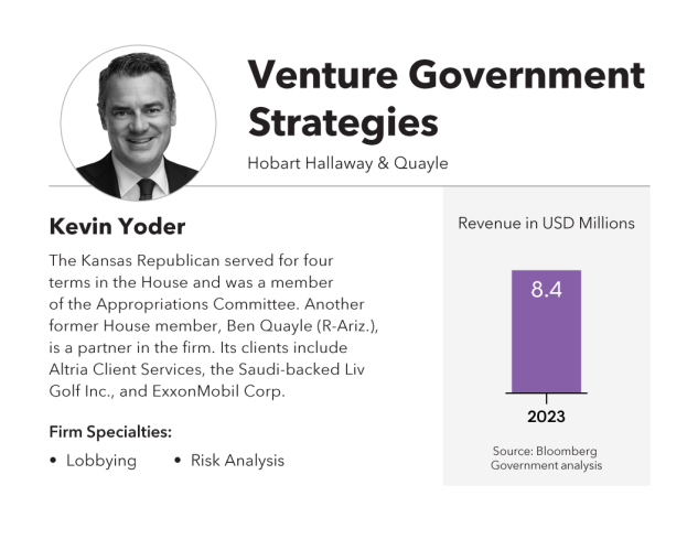 Its current partner lineup additionally includes former four-term Rep. Kevin Yoder (R-Kan.), who served as a senior member of House Appropriations, leading at times its Homeland Security and Legislative Branch subcommittees.