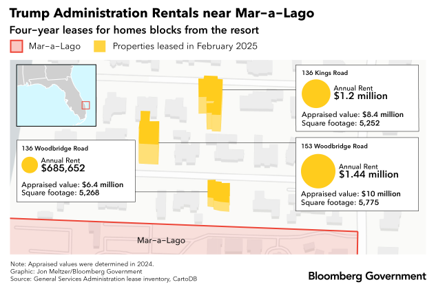 The listing for the house shows it as a $100,000 monthly rental. That means federal officials aren’t getting a long-term discount but instead paying that same rate every month over a four-year lease. The house was appraised at $8.4 million in 2024, according to Palm Beach County property records.