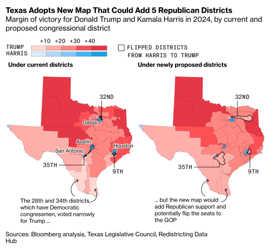 And in Texas: The state House of Representatives approved a plan to create as many as five more Republican-tilted congressional districts in Texas in a special session. The Texas state Senate, which is also controlled by Republicans, is expected to take up the effort today. Approval there would send it to Gov. Greg Abbott (R) for his signature.