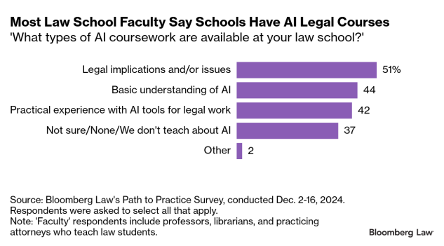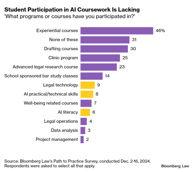 While this data is slightly dated, law schools typically innovate at a slower pace. Given the advances being made with AI, there may be greater change in the 2025-2026 school year to prepare law students for the workforce.