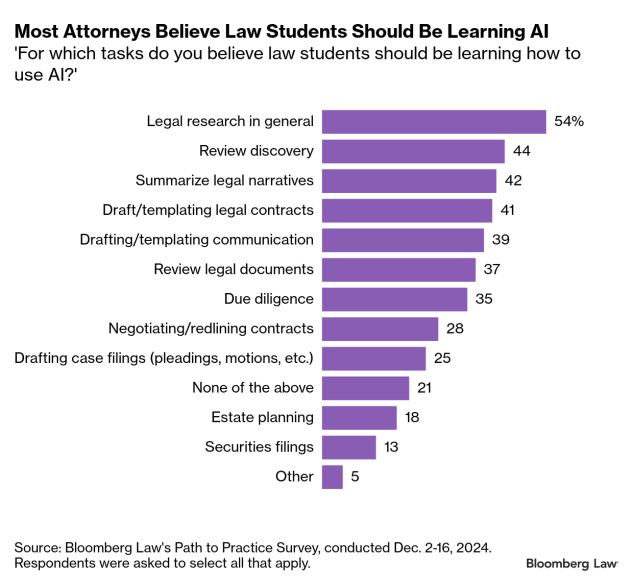 Almost 80% of the lawyers surveyed in the 2024–2025 school year (compared to 84% in the 2023–2024 school year) said that law students should be learning AI for at least one of the tasks listed in the chart below.