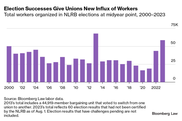 Labor unions successfully organized more than 58,000 workers through the National Labor Relations Board’s election process in the first six months of 2023, a massive influx of workers on a scale that we’ve rarely seen before—but that we’re likely to see again.