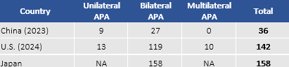 Source: US – the US Advance Pricing and Mutual Agreement Program (“APMA Program”), Announcement and Report Concerning APA (Mar. 27, 2025), p. 4. ; Japan – National Tax Agency, Japan, Mutual Agreement Procedures (“MAP”) and Bilateral Advance Pricing Arrangements (“BAPA”) Report 2024, p. 2.; China – STA, 2023 China APA Annual Report (Dec. 26, 2024), p. 69-71.