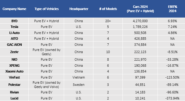 Note: We did not include legacy automobiles such as Toyota, Volkswagen, and General Motors who also sell EVs.