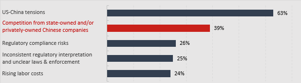 Intensifying competition from local players is emerging as a primary challenge for foreign businesses in China. According to the latest survey, 39% of the American companies expressed their rising concerns about the competition from state-owned and/or privately-owned Chinese companies. This challenge was ranked 4th in 2021, out of top 5 in 2022 and 2023, ranked 5th in 2024 and jumped to the second position in 2025.