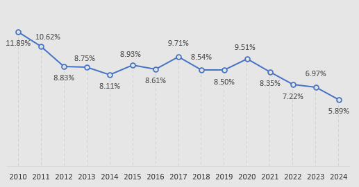 Dentons has performed an extensive, long-term profit tracker for Chinese companies. The median profit rate of the companies in China has gone down from 11.89% in 2010 to 5.89% in 2024, which is a 50% decline over the past 15 years.